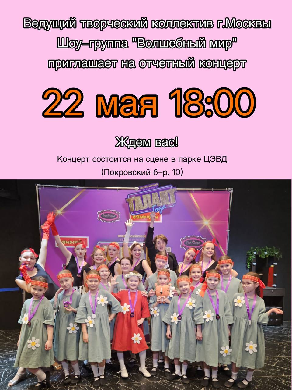 Ведущий творческий коллектив города Москвы Шоу-группа «Волшебный мир» приглашает на отчетный концерт в Милютинский сад!