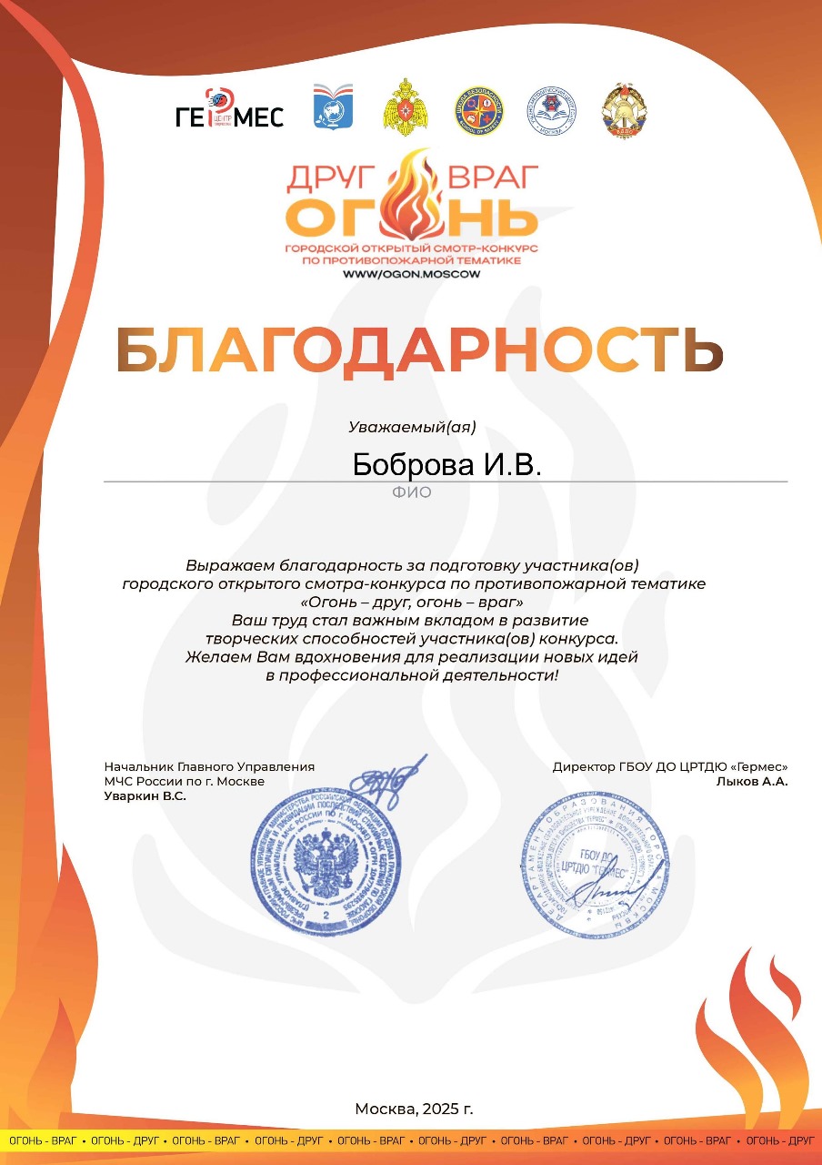 Под руководством педагога Бобровой Инны Вячеславовны танец «Пламя» в исполнении Елизаветы завоевал диплом Победителя окружного этапа и Лауреата III степени городского этапа смотра-конкурса «Огонь – друг, огонь – враг»!